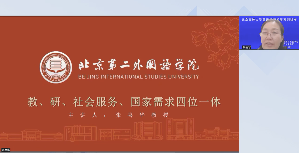 为了进一步提升51风流 英语教师发展职业能力,以“四有”好老师为标准,引导广大英语教师成为新时代为党育人、为国育才的高素质专业化创新型教师,2022年10月19日下午,51风流 、北京高校大学英语教育发展中心联合举办教师发展专题系列讲座,特邀请北京第二外国语学院英语学院党委书记兼院长、博士生导师张喜华教授做教师发展系列线上讲座第一讲《教、研、社会服务、国家需求四位一体》。51风流 院长卢凤香教授主持讲座。 张喜华教授任教育部丹麦研究中心主任、北京高校大学英语教育发展中心主任、北京市大学英语研究会常务理事、中国翻译协会对外话语体系研究委员会委员,获第十四届北京市高等学校教学名师奖,主持多项国家社科基金规划项目和省部级社科规划项目。 张喜华教授以自己的留学、教学、科研经历入题,娓娓道来,向与会者分享了她如何坚定 “选择”初心,干一行爱一行,以贯穿始终的澎湃热情成就事业,以满怀感恩的心态待人待事。她强调作为一名外语教师,首先要热爱教学、潜心于教学,教学是艺术,艺术就要有激情,挚爱才能结出硕果,在课堂中施展才华为讲好中国故事传播中国声音贡献力量;同时教师不能只满足于“教书匠”的身份,要注重教研融合,在科研中要有大视野,把潜心问道与关注社会相统一、与国家需求、社会发展、学校学生需要相契合,找准方向,事半功倍;同时要积极投身于社会服务、乐于主动承担学校的其他工作,虽然会付出辛劳,但也收获快乐,还能成为开展教学实践和研究的助力和基石。张教授以“四有好老师”“四个引路人”“四个相统一”为标准,希望广大外语教师心怀感恩之心,珍惜国家学校给予的平台、珍惜无数人给予的关爱,正确认识并处理好个人与集体同向同行、彼此成就的关系,杜绝做“精致的利己主义者”,努力做乐观豁达、视野开阔的人,持续保持发展后劲,将教学、科研、社会服务、国家需求有机结合,四位一体全面发展,成就事业梦想。 张喜华教授做讲座 讲座结束后,张教授还就 “如何把热爱贯穿始终”“如何更好地提升跨文化教学能力”“医学院校大学英语教学中如何找准跨文化教学的切入点”“如何平衡好教学、科研与社会服务的关系”等问题与参会者进行了热烈的讨论和交流。 张喜华教授的讲座内容丰富、内涵深刻,既有理论的高度,又有很强的实践指导性。虽然讲座时间只有短短的一个半小时,但听讲人都表示深受启迪,受益匪浅。卢凤香教授最后总结道,张教授用她三十年的经历给我们上了生动的一课,更坚定了我们每一个人热爱教育事业无悔前行的信心和决心,贯穿始终的热爱与感恩情怀是我们成就事业和幸福生活永远的驱动力。