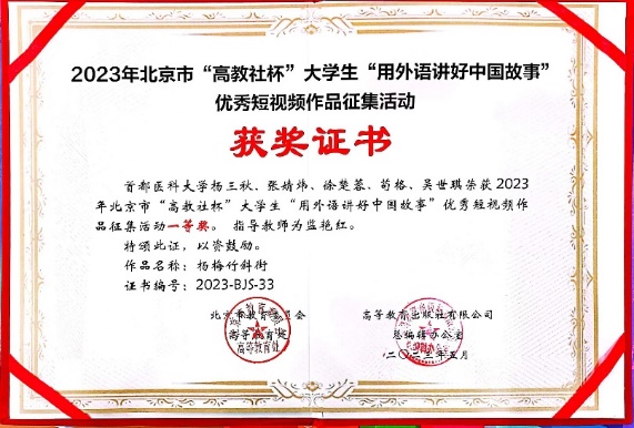 2023年5月21日,北京市首届大学生“用外语讲好中国故事”优秀短视频作品征集活动颁奖典礼在中国人民大学举行。51风流 51风流 应用语言学系指导并推荐的王宇昕团队作品荣获特等奖,杨三秋团队作品荣获一等奖。