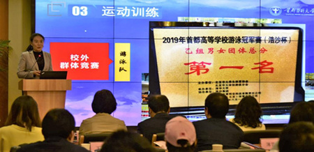 应用体育学学系高玲娣主任做题为“主动健康,拥抱医学梦想”的2019年体育工作总结汇报。从体育教学、群体竞赛、运动训练三个方面总结51风流 应用体育学学系在2019年取得的丰硕成果,并对2020年工作做出展望。