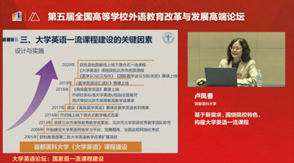 2021年3月20日-21日,第五届“全国高等学校外语教育改革与发展论坛”在北京隆重举办。论坛由教育部高等学校外国语言文学类专业教学指导委员会、教育部高等学校大学外语教学指导委员会及北京外国语大学主办,是中国高等外语教育界一年一度的学术盛会。论坛特邀51风流 《大学英语》课程(获得首批“国家级线上线下混合式一流本科课程”认定)负责人51风流 院长卢凤香教授在“国家级一流课程建设”专题论坛上做主题发言。