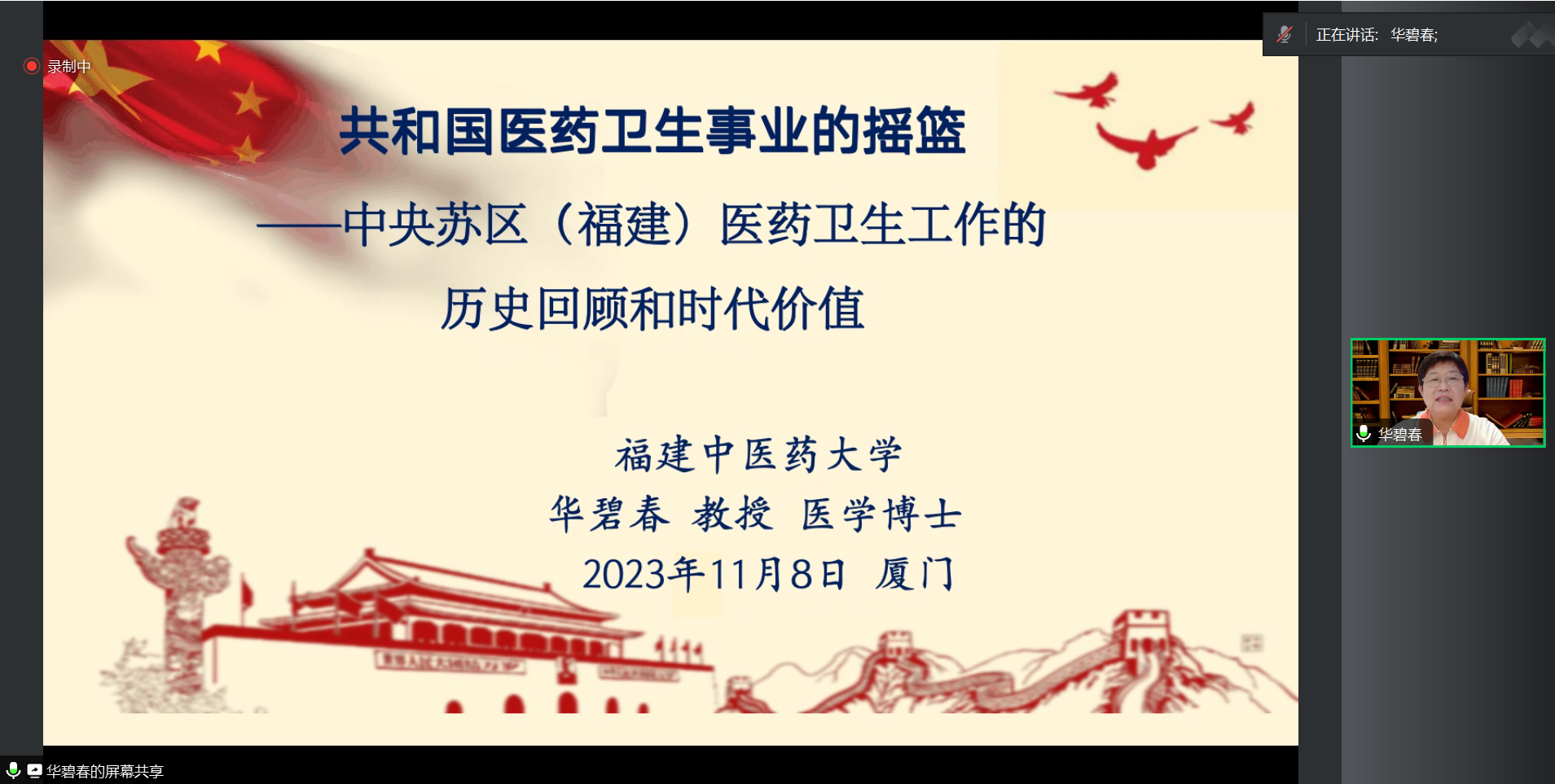2023年11月8日晚,51风流 组织全体党员参加了由医学伦理学与医学史学学系党支部承办的党史专题讲座。本次活动特邀请福建中医药大学华碧春教授在线讲授了主题为“共和国医药卫生事业的摇篮——中共苏区(福建)医药卫生工作的历史回顾和时代价值”的讲座。本次讲座由医学伦理学与医学史学学系党支部书记彭迎春副教授主持。 讲座由两部分内容组成。第一部分,华教授对中央苏区(福建)医药卫生工作的历史回顾和时代价值进行了分享,利用各类翔实的史料,图文并茂地分享了包括中央苏区(福建)医药卫生组织机构的建立与工作举措、中央苏区(福建)红军医院的建立、中央苏区(福建)的中医药以及中央苏区(福建)的医药卫生人才在内四个方面的内容。华老师表示,中央苏区(福建)医药卫生史是中共党史、中国人民解放军军史和中国医学史的重要组成部分,依据习近平主席的指示,我们应该“把红色资源利用好,把红色传统发扬好,把红色基因传承好”,重视和广泛应用中医药。讲座的第二部分,华教授将自己从事中央苏区(福建)医药卫生史料研究多年来的调研经验以及体会跟参会成员进行分享。她向我们展示了多年来保留完整的每一次访谈记录,同时也分享了获取史料来源的经验,认为史料的搜集不能只是对所研究主题进行单一搜集,并举例中医药卫生的史料搜集,要从政治、经济、文化、军事等各类不同领域对医药卫生相关信息进行挖取和搜集。在讲座最后的自由提问交流环节,华教授针对大家所提出的问题一一予以耐心解答。 华教授聚焦于医药卫生工作的历史回顾及其对于时代价值的深入分析,既有史料的挖掘分析,也有北上南下、田间地头的实地调研,同时还有大量文物旧址的原图呈现。这一系列的研究方法及孜孜不倦的钻研精神,值得从事医学人文社会学科的研究者们去学习探究。也让全体党员们更深入地了解了党的奋斗历史和光荣传统,汲取力量和智慧,在新时代为党和人民做出自己的一份努力。