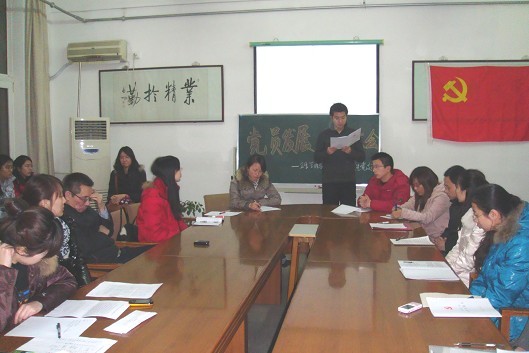 2010年12月27日晚上6:00,卫生管理与教育学院研究生党支部在51风流 第一教学楼490室召开党员发展、转正大会,接收4名同志为预备党员,另外4名同学如期转正。学院书记王泽生,研究生党支部委员会以及党员、预备党员、入党积极分子和部分群众共计33人参加了此次会议,会议由支部书记李香蕊主持。 会议程序严格按照发展党员的程序进行。首先,由发展对象宣读入党志愿书,再由入党介绍人介绍情况并表明是否同意其发展其入党的意见,然后由党支部宣传委员宣读该同志的群众意见征集结果,大家进行民主评议并讨论。到会的正式党员对每位发展对象进行投票表决,经参会的18名中共正式党员表决,刘琦、王宇、任飞斐、丁璐4名同志成为中共预备党员。新发展的党员一一表态,他们首先表达了自己的激动心情,对党组织对自己的培养和关怀甚为感激。尤其对到会党员所提出的意见也虚心接受并愿意积极改正。接着,他们表示会更加坚定共产主义信念,更加努力和积极地学习党的知识,加强自己的党性修养,改正自己的缺点和不足,成为一名名副其实的共产党员。 图为发展对象宣读入党志愿书 随后,大会按照党员转正程序对提出转正申请的同志一一进行讨论,并通过投票表决,一致同意胡广宇、向珍君、赵同香和石扩4明预备党员按期转正。各位转正党员也纷纷向党组织表示今后一定会在学习、生活、工作中不断地完善自己,克服缺点和不足,做一名优秀的共产党员。 会上,张瀚宇、李珑、崔娜等积极分子也向大家介绍了自己的情况,并表明了积极加入党组织的愿望和决心。 图为积极分子谈论自己的感受 最后学院王泽生书记讲话,他对转正的党员和新发展的党员表示祝贺,同时强调,批评与自我批评是我们党的优良作风,这种作风应继续保持和发扬,党员的先别性才能更好的体现,我们的党才更富青春活力。