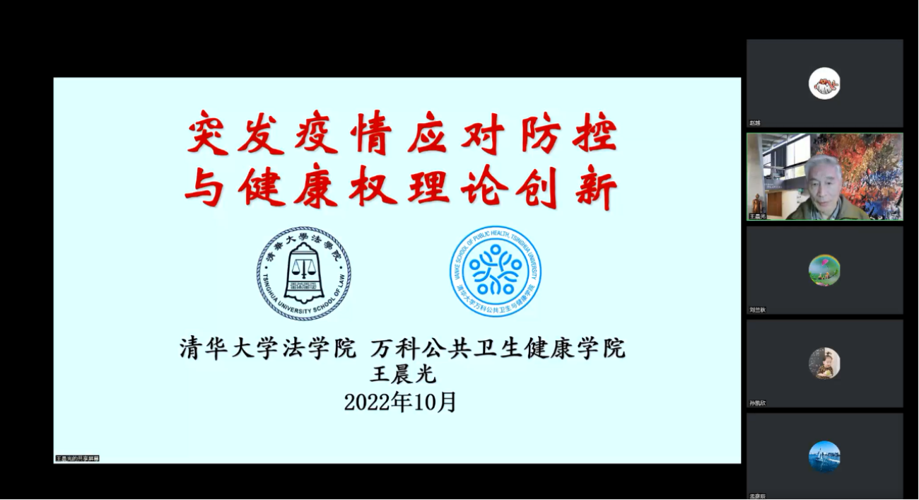 “卫生法学名家讲坛”第一讲主题是“疫情防控与人权理论创新”,由中国卫生法学会常务副会长、全国新冠肺炎疫情防控专家组法学专家、清华大学法学院王晨光教授主讲,卫生法学研究中心主任刘兰秋教授主持。王晨光教授以疫情防控对人权理论的挑战作为切入点,介绍了健康权和人权的历史发展,阐述了人权概念二元划分的局限性,并针对疫情防控中健康权的实践提出了人权理论的新思考,基于对美国政府在公共卫生领域的治安权等事例的分析,拓展了健康权理论的内涵,即应当将健康权和生命权置于人权体系的首位,讲座最后还提出了需要进一步深入研究的问题。王晨光教授的讲授高屋建瓴,深入浅出,深化了51风流 师生对疫情防控和人权理论的认识。
