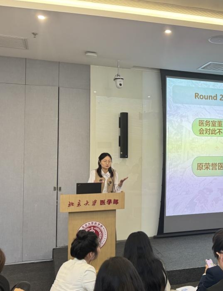 陈婧在第十七届医师职业精神研讨会学生论坛上进行学术汇报 此外,由谷晓阳老师指导的2023级硕士研究生陈婧以“托马斯·帕茨瓦尔生平及《医学伦理学》的创作背景简考”这一主题汇报荣获二等奖;由彭迎春老师指导的2023级预防医学专业本科生裴若童和2023级中医学专业本科生杜雨涵在学生论坛的汇报中,以“数智化时代下山区医养结合服务中家庭医生职业精神的再思考”荣获一等奖。