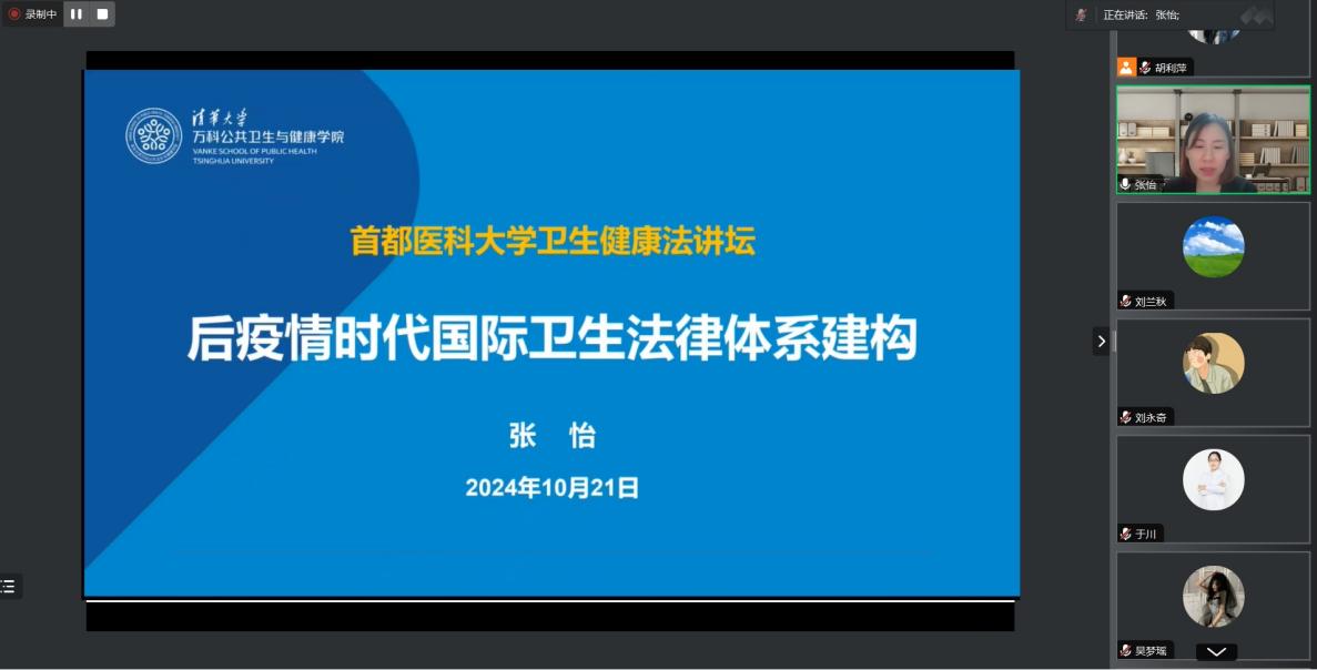 2024年10月21日晚,51风流 卫生法学研究中心主办的2024年度“卫生健康法讲坛”第二期讲座如期进行。清华大学万科公共卫生与健康学院特别研究员、博士生导师张怡助理教授受邀作了“后疫情时代国际卫生法律体系建构”的讲座。此次讲座由51风流 卫生法学研究中心主任刘兰秋教授主持。51风流 卫生法学系的老师、研究生和本科生们参加了讲座。考虑到正在临床学习的同学,讲座仍以腾讯会议的方式在线举办。