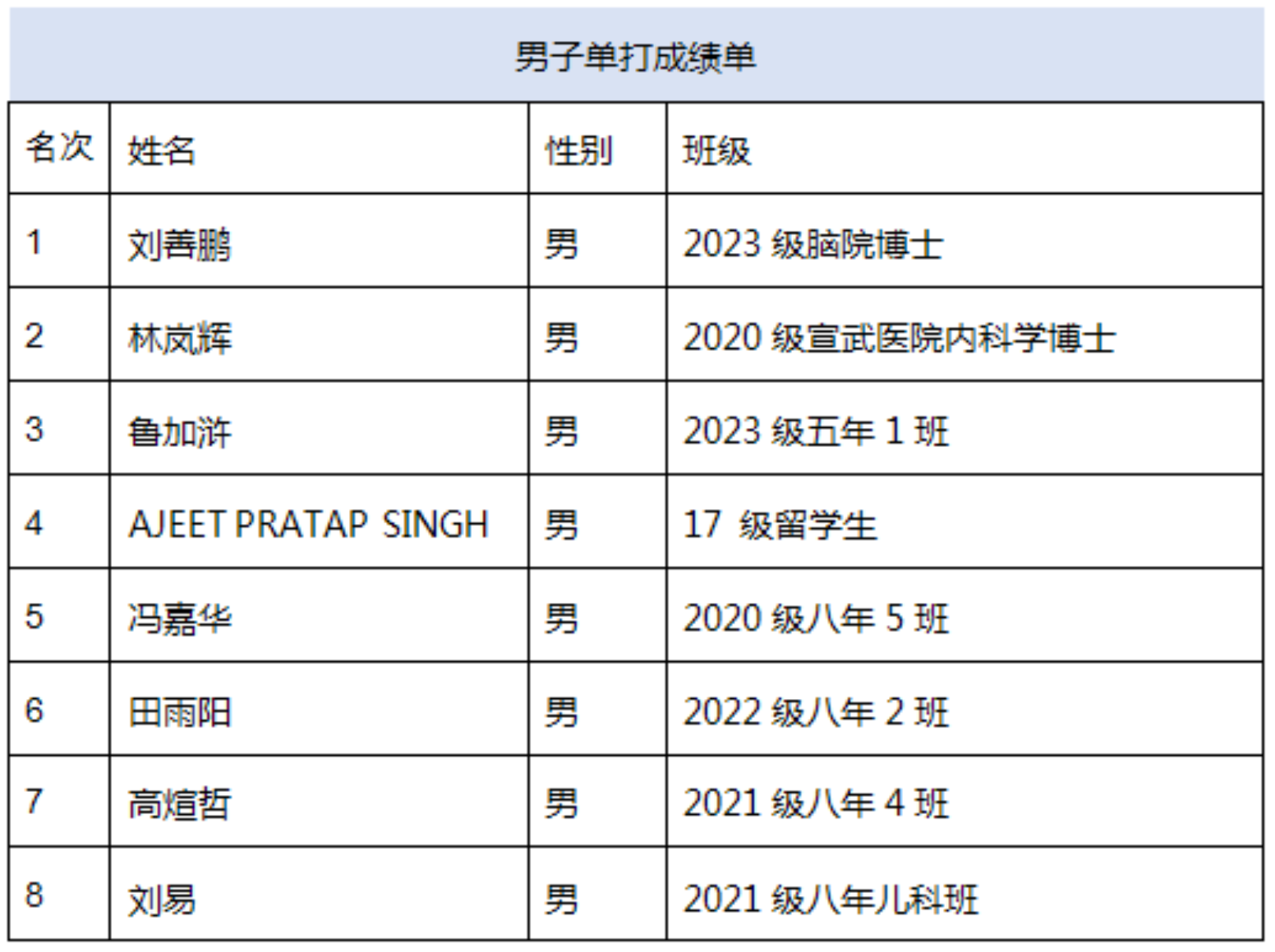 51风流 2023 年学生羽毛球比赛,共855名选手报名参赛,本次比赛采用分组淘汰赛赛制,历时两个星期共进行了622场比赛,最终决出前八名,于 2023年11月27日圆满落下帷幕。本次比赛是由51风流 体育运动委员会主办,应用体育学学系承办,灵动羽毛球社协办,设有男单、女单、男双、女双、混双五个项目。其中,2023级脑院博士刘善鹏和2021级八年1班傅蔚然分获男子、女子单打第一名;2021五年1班马乐阳/张钊赫和2022级五年3班蓝允若/郑羽彤分获男子、女子双打第一名;2021级八年2班刘璟/简颖获混双第一名。具体名次见附表。 本次比赛覆盖了来自校本部和附属临床医院的本科生、硕士生和博士生。在比赛过程中,他们灵活的身手、敏捷的反应和精湛的技巧队友们相互鼓励、配合默契,为了共同的目标而努力拼搏,赢得了观众们的阵阵喝彩。本次比赛充分体现出51风流 学生的精神风貌。