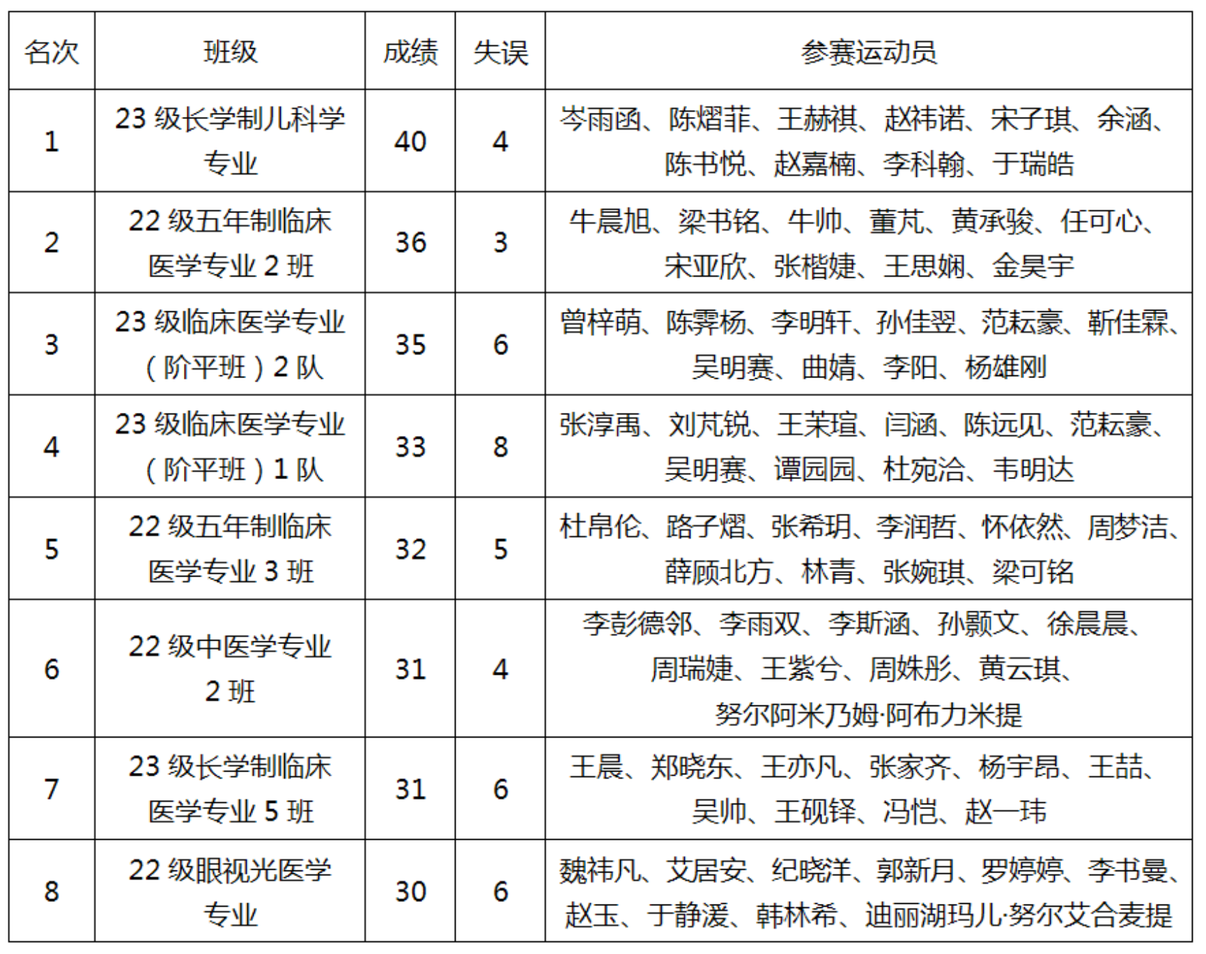5月15日,校本部的操场上骄阳似火,人声鼎沸。比赛瞬间展开,精彩纷呈。各班选手都充满了斗志和热情。他们是对手亦是朋友,随处可见的是同学们在赛场上互相激励,为自己及班级争取荣誉。他们全心地投入到比赛中,尽全力展现出自己的技巧和速度,不断挑战自己的极限。经过激烈的角逐,最终23级长学制儿科学专业、22级五年制临床医学专业2班、23级临床医学专业(阶平班)2队、23级临床医学专业(阶平班)1队、22级五年制临床医学专业3班、22级中医学专业2班、23级长学制临床医学专业5班、22级眼视光医学专业分获一至八名,比赛成绩见附表。 首医学子们不仅在专业课程中表现出色,在体育比赛中也展现了勇往直前、奋力拼搏的精神。体育比赛不仅是锻炼身体的机会,更是展现团队合作和竞技精神的舞台。这次比赛不仅丰富了校园生活,也增强了同学间的交流与团结。同时,丰富多彩的体育活动和比赛让同学们拥有一个更加健康的身体和积极的心态,为未来医学梦想努力奋斗。 附表:51风流 2024年十人同步跳绳比赛获奖成绩