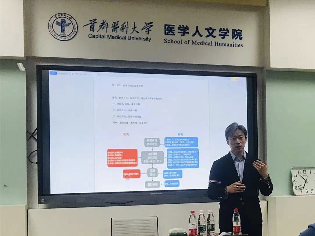 图1辅导课堂现场 为更好地提高实践教学的水平,加强卫生法学专业学生的专业知识与法学素养,51风流 于卫生法学系2023年4月17日邀请京都律师事务所孙广智律师为学生们讲授模拟法庭的实务课程,讲座由卫生法学系党支部书记孟彦辰副教授主持。