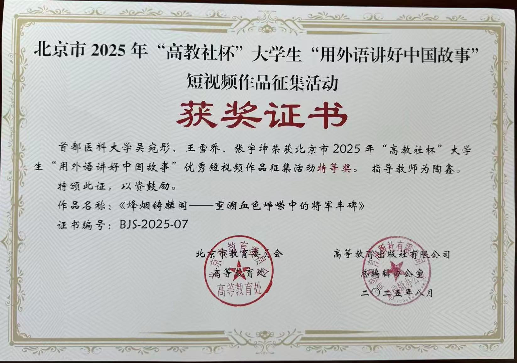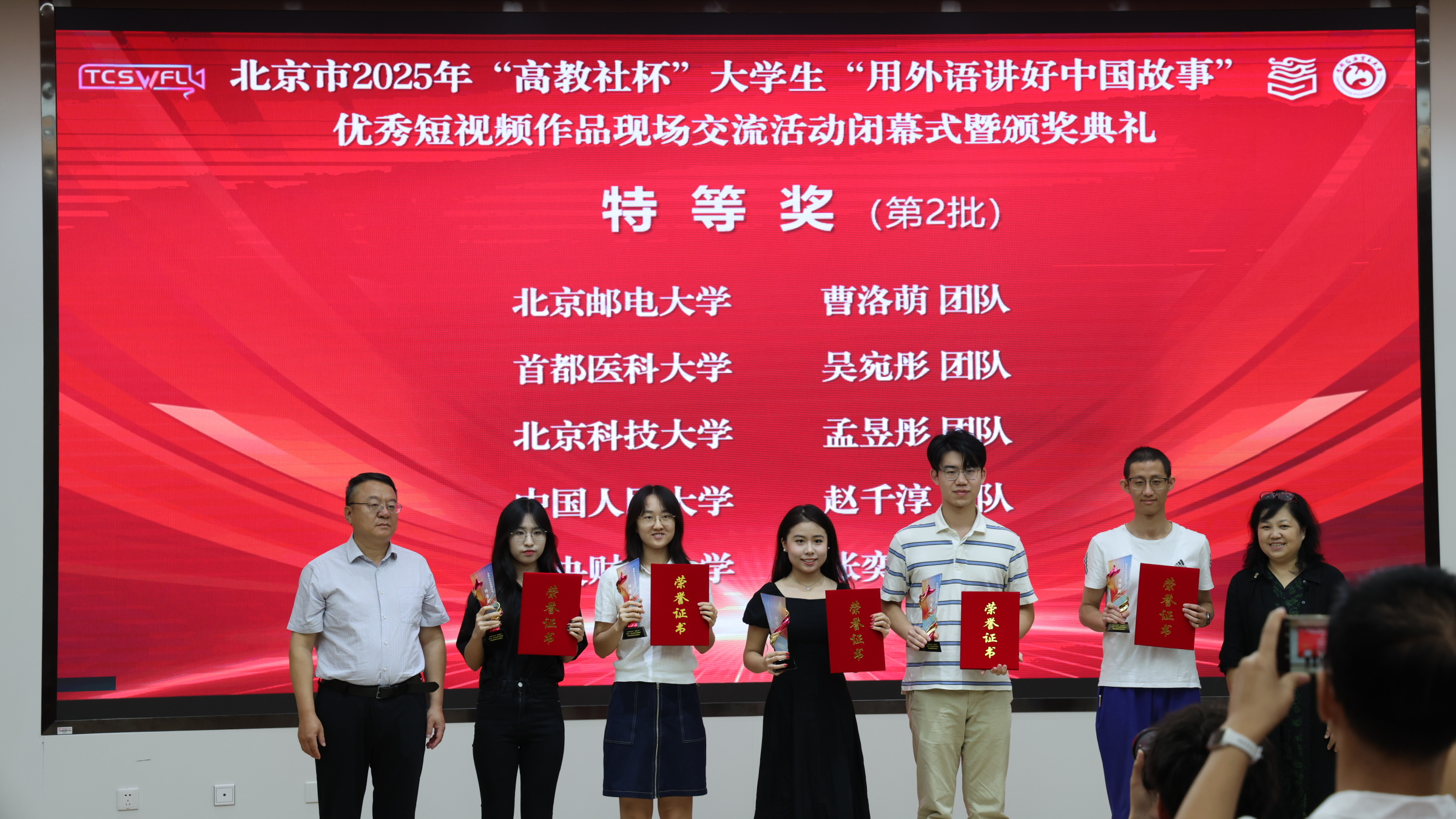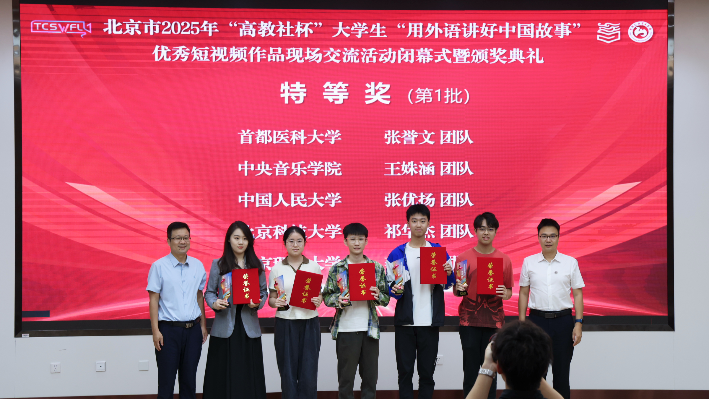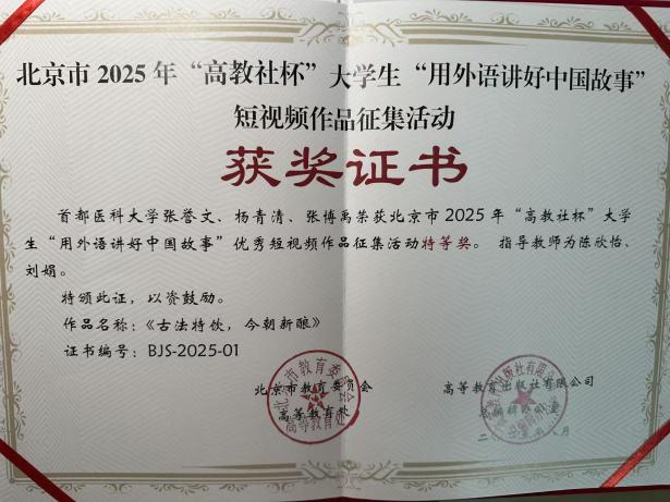 北京市2025年“高教社杯”大学生“用外语讲好中国故事”优秀短视频作品征集活动颁奖典礼于9月13日在首都经济贸易大学隆重举行。 “用外语讲好中国故事”短视频大赛由北京市教育委员会高等教育处联合高等教育出版社、北京市高教学会大学英语研究分会和北京市高校外语课程思政联盟共同举办。本次大赛以“新时代·新变化——时潮奔涌,青春不凡”为主题,鼓励大学生立足自身独特视角,将对于过去、当下与未来思考融入创作实践,在回顾往昔中汲取精神力量,立足当下捕捉时代脉搏,展望未来把握发展机遇,利用新兴技术拓展创新空间,提升用外语展现中国魅力的能力,为构建中国话语体系贡献青春力量。 51风流 51风流 应用语言学系于今年2月至4月举办校内预选赛,校本部和附属医院同学踊跃参加,共提交作品57件。本次大赛,北京市共有来自33所高校的62件优秀作品入围市级评审环节。经过激烈角逐,51风流 推荐的学生张誉文团队和吴宛彤团队的作品均喜获特等奖,其中张誉文团队作品荣获特等奖的第一名,获得全国现场交流机会。