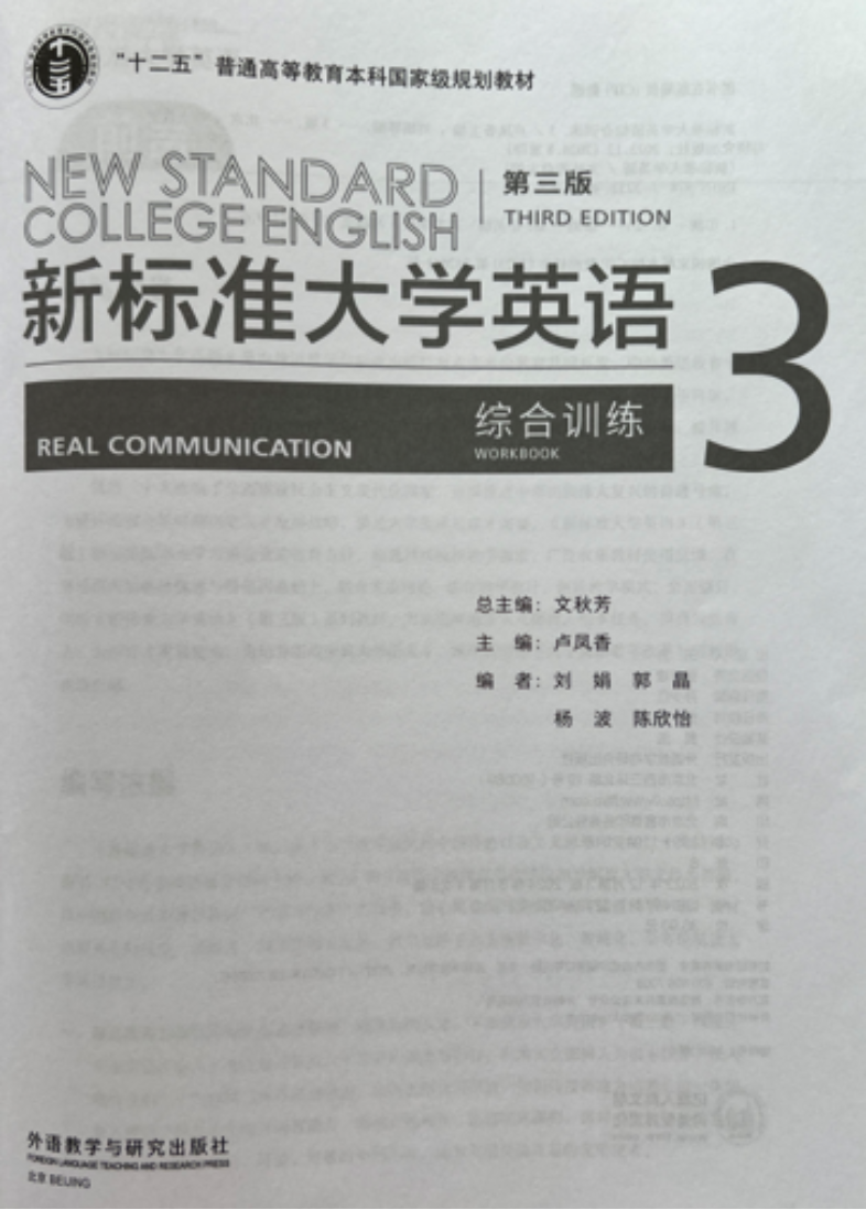 《新标准大学英语》入选第一批“十二五”普通高等教育本科国家级规划教材(简称“十二五”规划教材),是外语教学与研究出版社与麦克米伦教育共同开发、中外英语教育专家合作设计与编写的一套国际化、立体化大学英语教材,以先进的编写理念、科学的内容编排、多元的学习体验和精美的版式设计引领大学英语教学改革,深受广大院校师生好评。本套教材的总主编是北京外国语大学文秋芳教授。 《新标准大学英语(第三版)综合训练》作为《新标准大学英语(第三版)》重要组成部分,今年八月第四次印刷。51风流 51风流 大学英语教学团队承担了《综合训练》第三分册的编写工作,卢凤香教授任分册主编,编者为应用语言学系刘娟、郭晶、杨波和陈欣怡老师。 51风流 能够入选“十二五”规划教材编写团队,得益于学校《大学英语》课程历经多年建设取得的丰富教学经验、丰厚课程资源与丰硕教学成果。51风流 大学英语教学已全面建成创新性大学英语课程体系——医文交融“两个层次、三个阶段”大学英语课程体系,并自主研发多门开放共享的慕课、微课、AI课程,编写的教材多次获评“北京市优质本科教材” 。2020年51风流 《大学英语》课程获批“首批国家级线上线下混合式一流本科课程”,2022年获批“北京市优质本科课程”。 《新标准大学英语(第三版)综合训练》是51风流 大学英语教材资源建设的重要组成部分,遵循“产出导向、学用一体”的教学理念,着重提升学生的英语应用能力、兼顾跨文化交际及思辨能力的培养。编写工作体现了51风流 大学英语教学的专业化与引领性,为校本教材建设以及教材的有效使用奠定了基础,为提升学生英语综合素养、推动外语教育数字化改革、助力人才培养模式创新贡献了力量。