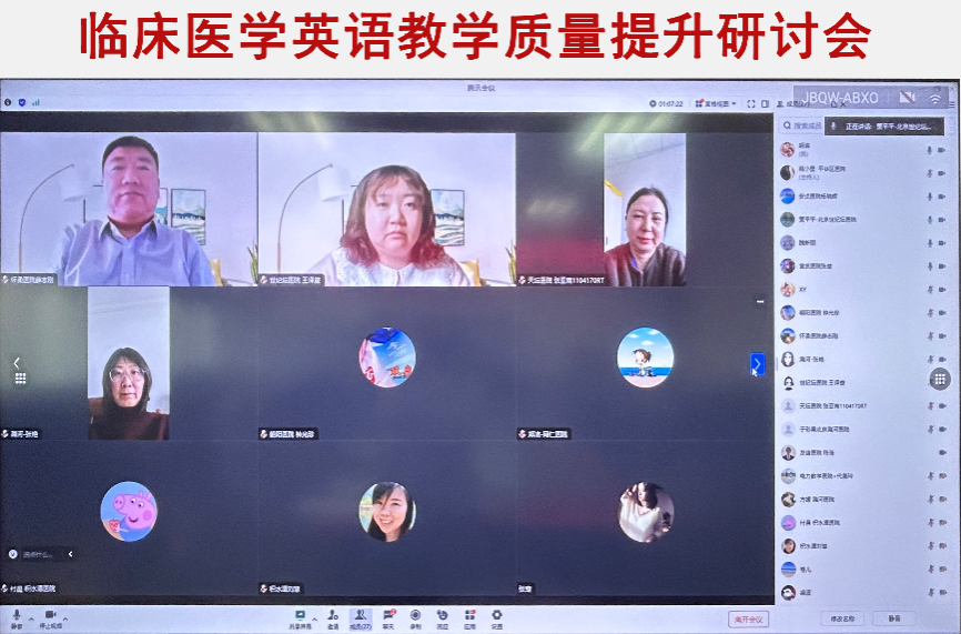 12月25日,随着冬日暖阳的照耀,51风流 医学英语联合教研室成功召开了2024年度教学质量提升研讨会。此次研讨会采用线上线下相结合的方式,来自宣武医院、友谊医院、朝阳医院、同仁医院、天坛医院、安贞医院、复兴医院等17家临床医学院、附属医院以及教学医院的医学英语联合教研室负责人及临床医学专业英语课程骨干教师们参与研讨会,共同探讨和推动医学英语教学质量的提升。会议由医学英语联合教研室主任卢凤香教授主持。尽管岁末年初,各位教师们的临床工作异常繁忙,但他们依然抽出宝贵时间,积极参与此次盛会,共同为医学英语教学的发展贡献智慧与力量。