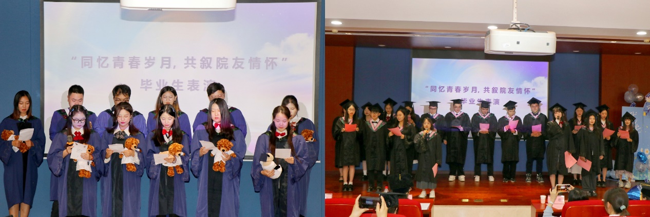 研究生表演和本科生表演 在“同忆青春岁月,共叙院友情怀”毕业生表演环节,毕业生们合唱《遇见》《你好,明天》,用歌声传递着对校园的热爱和对老师的敬意,传递出对同窗相遇的珍惜,传递出对美好未来的希冀。青春是永不落幕的歌,愿同学们奔赴明天的路上,永远记住曾经遇见的美好。