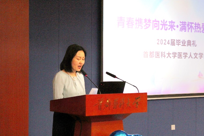 王君书记致辞 毕业典礼在庄严的国歌声中拉开帷幕。 学院党总支书记王君代表学院向毕业典礼致辞。致辞中,王书记向所有毕业生表示祝贺,向为学生成长辛勤耕耘的老师和家长表示由衷的敬意和诚挚感谢!她希望同学们未来依然要坚持不懈地追求梦想,坚守自己的信念和使命。并祝愿所有毕业生在未来的人生中继续书写精彩的篇章,取得更大成绩。