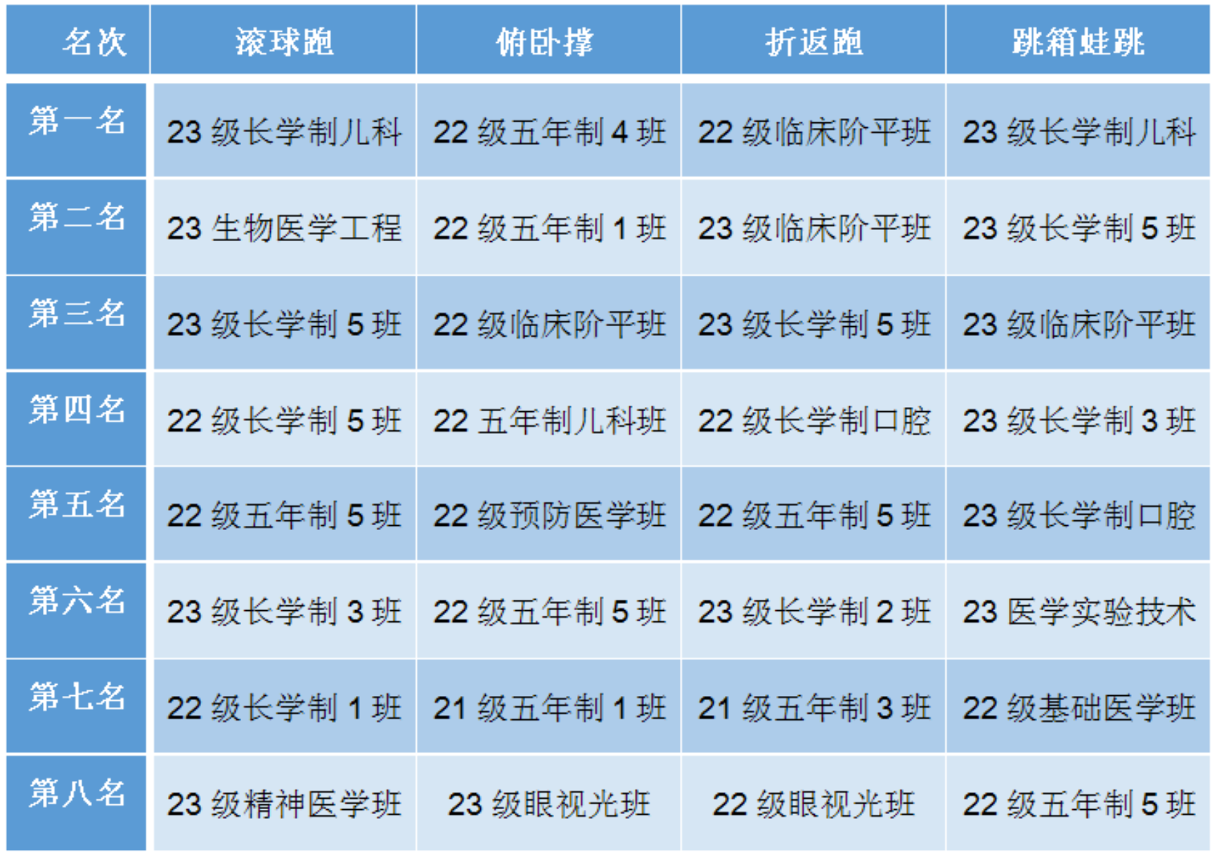 经过激烈的角逐,23级长学制儿科班、22级五年制4班、22级临床阶平班等班级分别获得了四个项目的团体前八名。具体见下表: