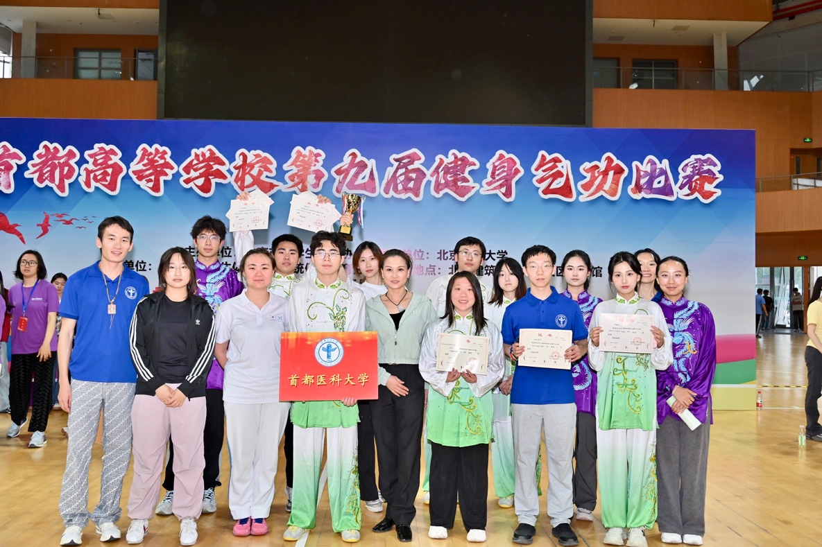 5月的运动场,绿意盎然,青春昂扬。5月18日在北京建筑大学举办的首都高等学校第九届健身气功比赛中,在教练员庄静老师的带领下,51风流 武术队以气韵悠长的功法演绎和精湛的技艺再次展示了卓越的竞技水平和独特的文化魅力,为校争光。本次比赛汇聚了多所高校的优秀团队,展示了健身气功这一国粹的独特魅力。首医武术队凭借过硬的技术和沉稳的表现,在集体与个人项目中屡获佳绩,并荣膺甲组团体总分第五的佳绩,展现了医学生独特的文化底蕴与精神风貌。 匠心集体项目,五禽戏与导引功尽显国粹精华 在集体项目中,首医武术队以流畅的配合和精美的动作完成了集体五禽戏与集体导引养生功十二法的比赛。五禽戏将虎之威、鹿之灵、熊之稳、猿之敏、鸟之轻展现得淋漓尽致,动作行云流水;导引养生功十二法则以舒展的动作和深厚的内功,体现了气功的健身效果与文化内涵。场上队员们气定神闲,团队成员之间默契十足,动作整齐划一,动作舒展自然,将传统文化之美融入每一招一式,赢得了评委的高度评价和观众的阵阵掌声。