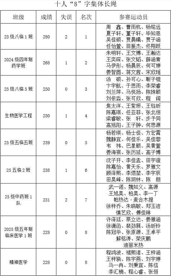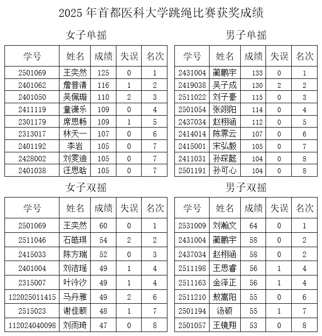 阳光洒满校园操场,参赛选手们精神抖擞。单摇项目率先拉开帷幕,选手们手中的跳绳飞速旋转,脚步轻盈地跳跃,绳子与地面摩擦发出有节奏的声响,让人目不暇接。在双摇比赛中,选手们展现出更高超的技巧,身体高高跃起,跳绳快速绕身两周,引得观众阵阵惊叹。十人八字集体项目则将比赛气氛推向高潮。每支参赛队伍的十名成员紧密配合,摇绳者有节奏地挥舞长绳,跳绳者则按照默契的顺序,依次穿梭在长绳之间,如同灵动的燕子。他们步伐矫健,动作流畅,脸上洋溢着自信与团结的光芒。赛场上,有的队伍配合失误,但成员们迅速调整,互相鼓励,继续投入比赛,充分展现了顽强拼搏、不放弃的精神。 经过两天激烈角逐,各项目名次尘埃落定。在单摇项目中,来自24级中医1班的蔺鹏宇同学凭借出色的节奏感和稳定发挥,斩获男子组冠军;女子组单、双摇冠军均被25级八临1班的王奕然同学收入囊中,她以轻盈的身姿和快速的跳跃频率征服了现场观众和裁判。那男子双摇项目中,来自25级中医班的刘瀚文同学脱颖而出获得冠军,展现了超强的体能和技巧。十人八字集体项目竞争最为激烈,最终23级八临1班凭借完美的配合和出色的速度,赢得冠军。其余获奖同学详见附表。 本次跳绳比赛不仅是一场体育竞技,更是同学们释放青春活力、增进友谊、增强团队凝聚力的盛会。它让同学们在紧张的学习之余,享受运动带来的快乐,也展现了51风流 学子积极向上、团结奋进的精神风貌。