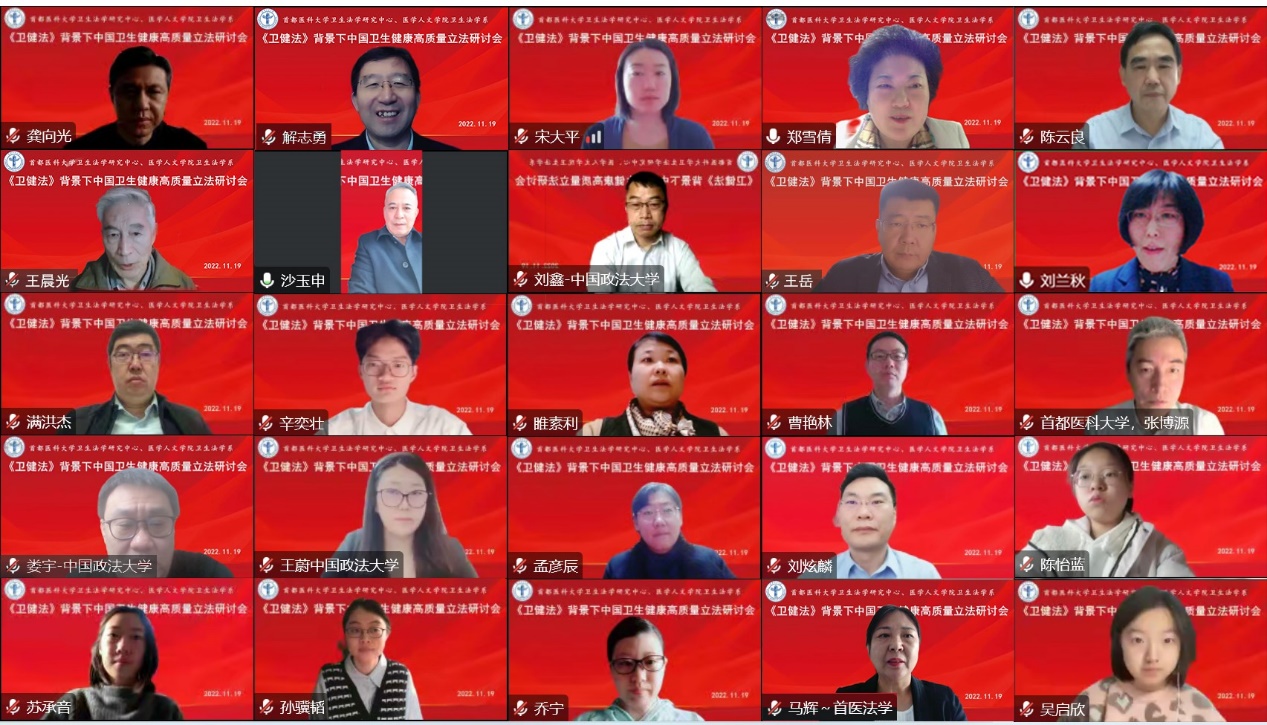 党的二十大报告强调坚持全面依法治国,推进法治中国建设,强调把保障人民健康发展优先发展的战略位置。推进卫生健康领域的立法进程,实现卫生健康立法的系统性科学性,精细化,对于实现卫生健康事业的中国式现代化至关重要。2022年11月19日上午,由51风流 卫生法学研究中心和51风流 卫生法学系主办的“《卫健法》背景下中国卫生健康高质量立法”研讨会顺利举行。来自国家卫生健康委员会、中国卫生法学会、清华大学、北京大学、中国政法大学、华东政法大学、广东外语外贸大学、北京协和医学院、51风流 、中国医学科学院医学信息研究所、国家卫生健康委卫生发展研究中心、北京市华卫律师事务所的近二十位专家学者齐聚云端,围绕《基本医疗卫生与健康促进法》颁行后中国卫生健康立法的模式与内容展开热烈研讨。
