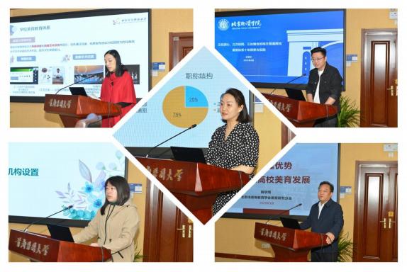 五所高校的美育工作负责人发言 交流环节,来自五所高校的美育工作负责人分别围绕各自学校的美育工作建设目标、重点工作及创新做法等方面进行探讨。51风流 艺术教育学学系主任商玮娜介绍,经过多年探索实践,逐步形成具有首医特色的“医学+艺术”的美育课程体系和“一核四维”的美育教育模式。北京农学院教研室主任张琳分享了团委艺教中心与文化艺术教研室双管齐下、双轨并进的工作模式,共同助力人才培养。北京信息科技大学副教授肖潇交流了学校实施“美育浸润行动计划”,持续加强校际协同、校馆协同、校企协同,提升师生审美素养。北京物资学院艺术教育中心王昊天分享了建立由校级领导负责、相关职能部门协同、公共艺术教育教学部门具体实施的公共艺术课程工作机制。北京科技大学人文素质教育中心副主任韩学周介绍了人文素质教育中心“四位一体,一体两翼”的课程体系,以及“八位一体,一体六艺”美育课程体系。
