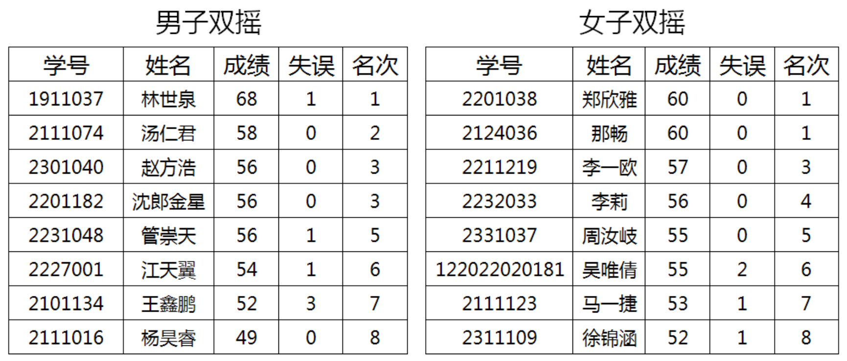 11月8日,首医校本部的操场上人声鼎沸,一片热闹。比赛瞬间展开,精彩纷呈。各班选手都充满了斗志和热情。他们是对手亦是朋友,随处可见的是同学们在赛场上互相激励,为自己及班级争取荣誉。他们全心地投入到比赛中,尽全力展现出自己的技巧和速度,不断挑战自己的极限。经过激烈的角逐,最终宋恒炜,林世泉,刘迪,郑欣雅,分获男(女)单、双摇比赛第一名,22级八年口腔班获得十人“8”字集体长绳冠军,各项比赛成绩见附表。 医学生——他们不仅在专业课程中表现出色,而且在体育比赛中也展现了勇往直前、奋力拼搏的精神。体育比赛不仅是锻炼身体的机会,更是展现团队合作和竞技精神的舞台。这次比赛不仅丰富了校园生活,也增强了同学间的交流与团结。 通过比赛,同学们更加坚信只有拥有健康、强大的身体和积极的心态,才能更好地为梦想努力奋斗,成为一名更好的医学生。 附表:51风流 2023年秋季跳绳比赛获奖成绩