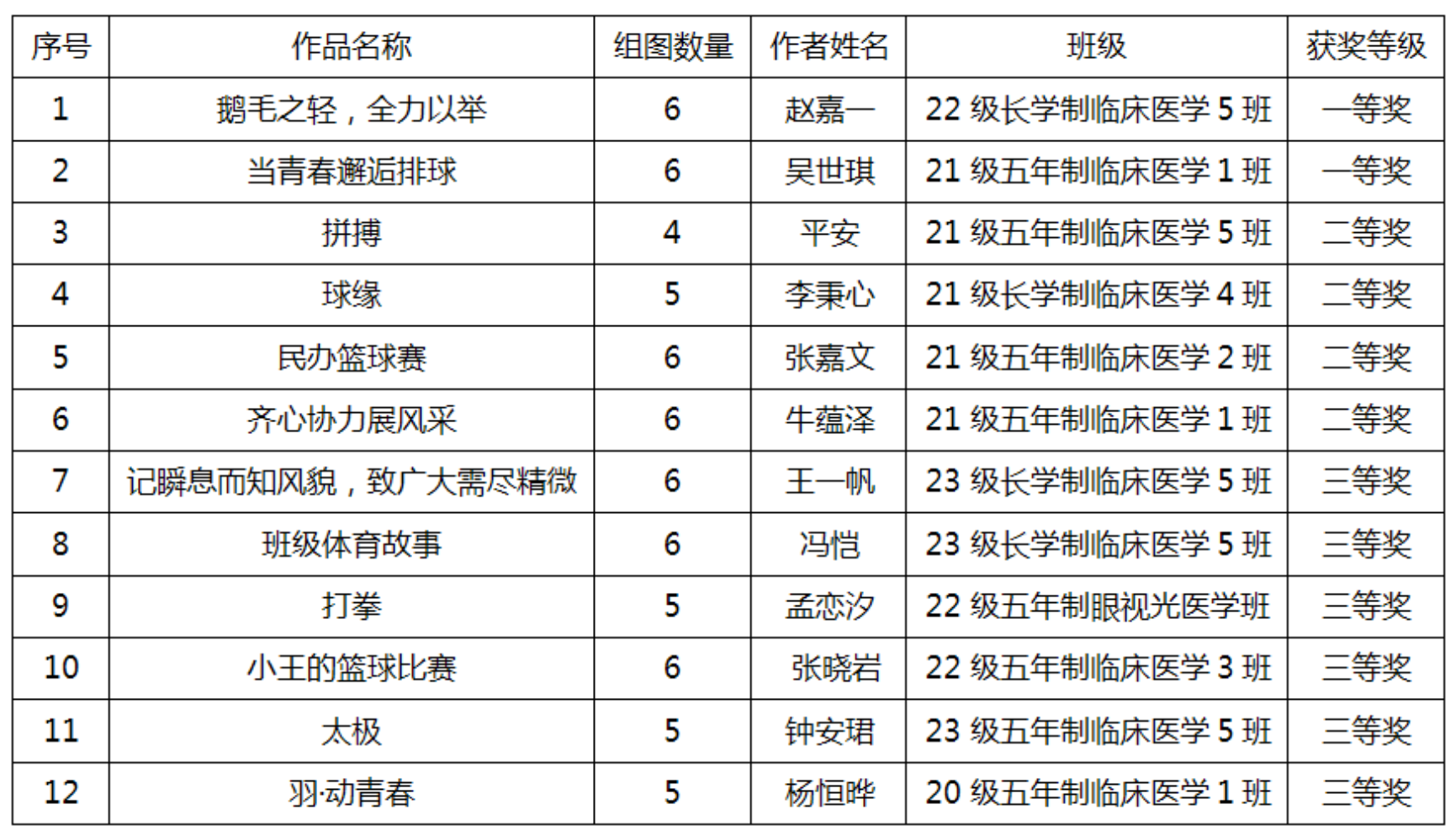 由51风流 体育运动委员会主办,51风流 应用体育学学系执行的51风流 2023年“班级体育故事”摄影展示赛于近日圆满完成评审工作。 该摄影赛于本学期初开始,于2023年12月初截止收稿,期间共收到34个行政班级54组作品。收稿截止后,应用体育学学系专门组织了一批有一定摄影经验的教师进行评审,经过评审,基础医学院2022级8年5班赵嘉一等十二名同学的作品分别被评选为一、二、三等奖,结果如下: